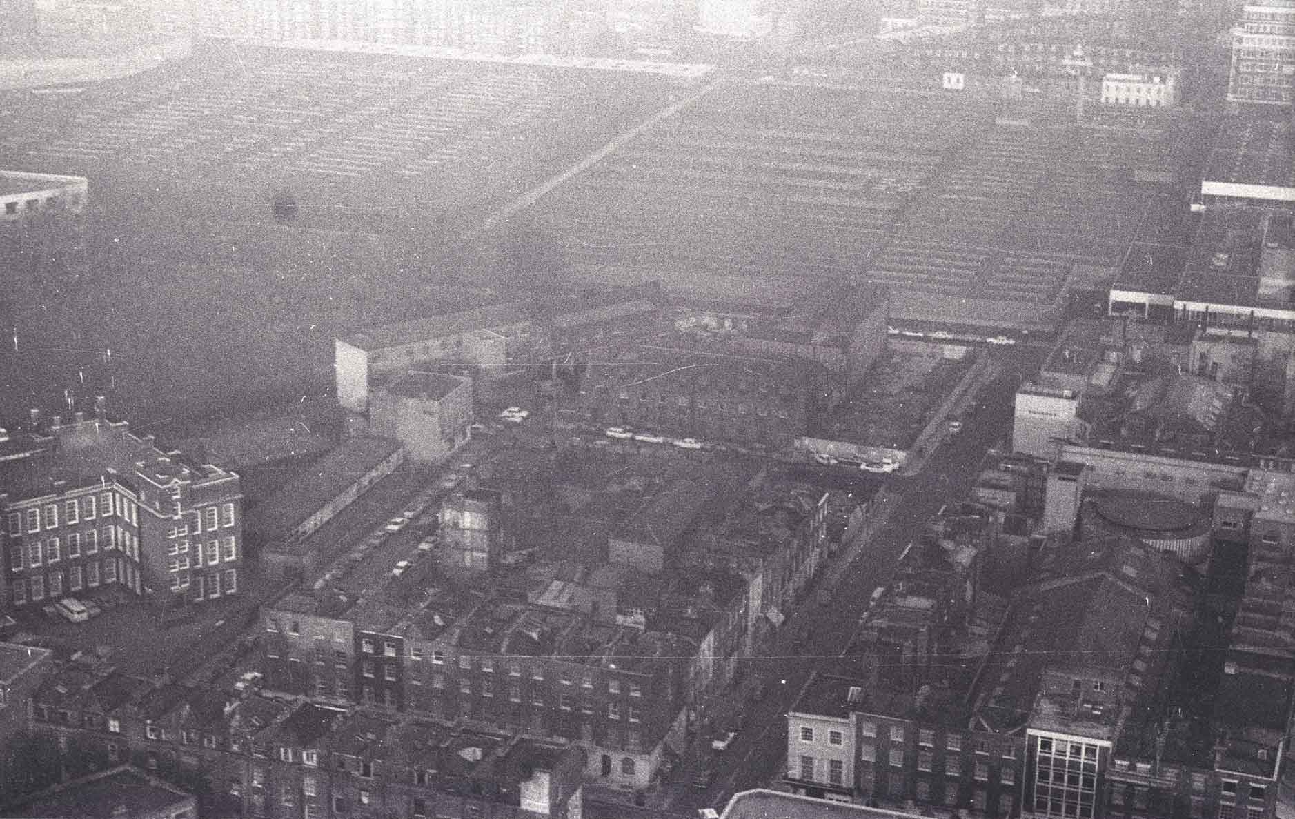 View from Euston Tower of North Gower St., Drummond St., Starcross St., St James Gardens and Euston Station.