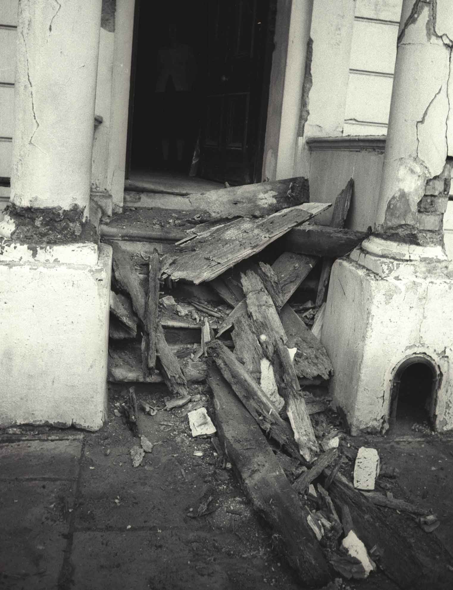 Partial collapse of balcony at 10 Tolmers Square, January 1976