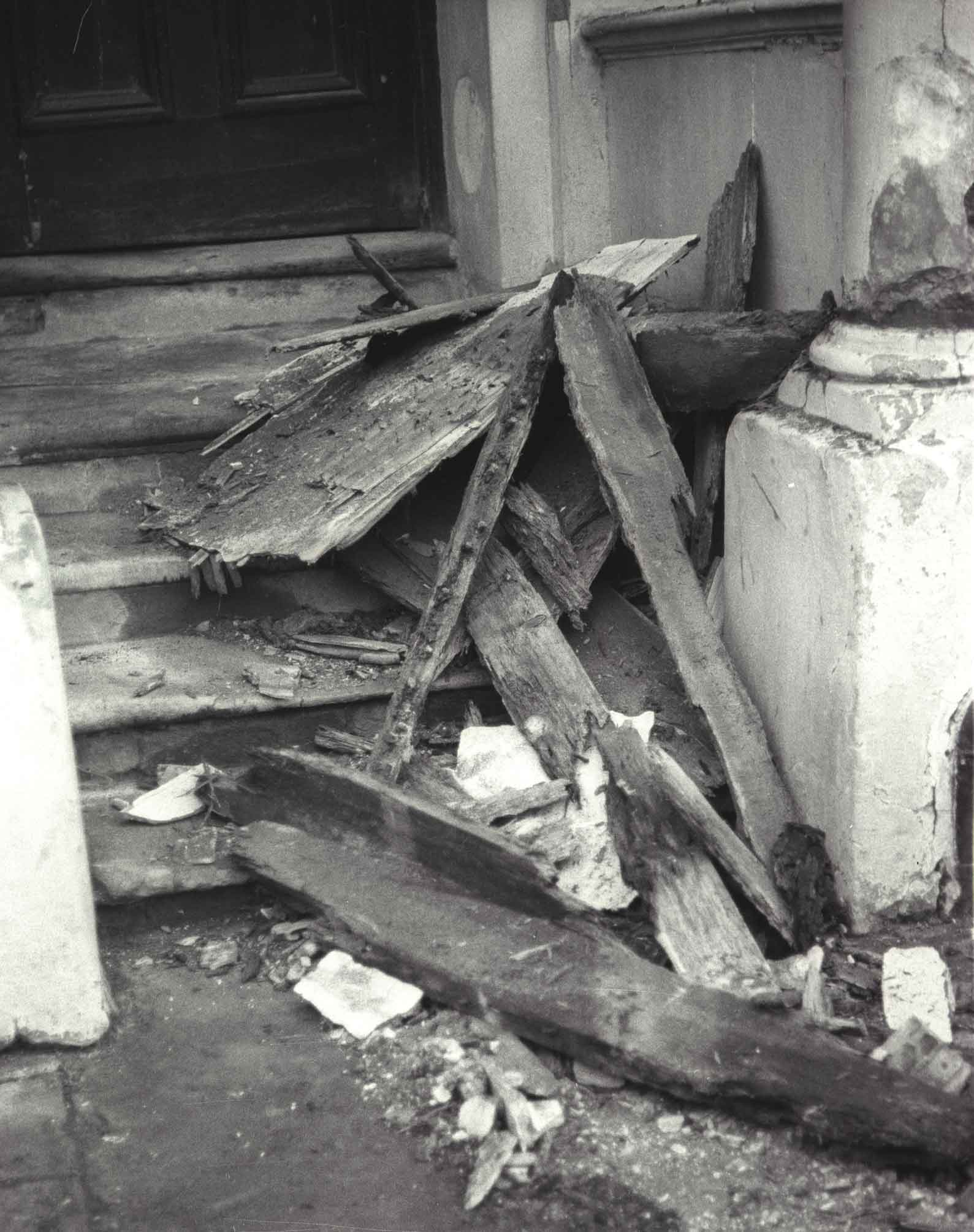Partial collapse of balcony at 10 Tolmers Square, January 1976