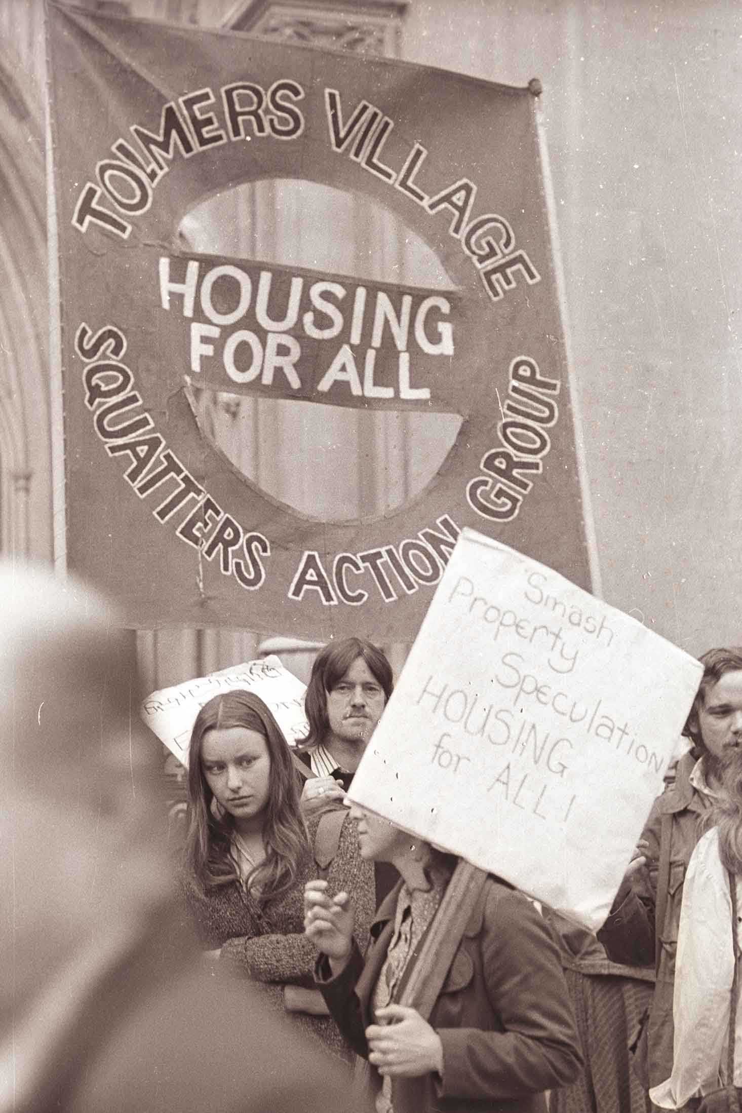 Outside the High Court in the Strand before the hearings into Tolmers Square evictions, 1975
