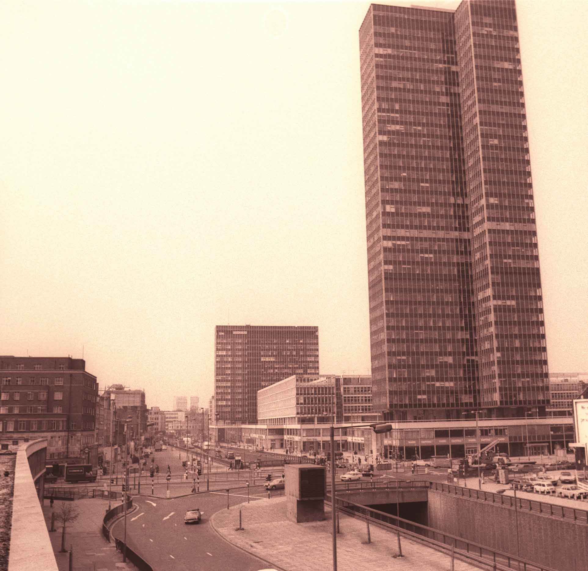 Euston tower, the Euston Centre and the Euston Road underpass. Looking west.