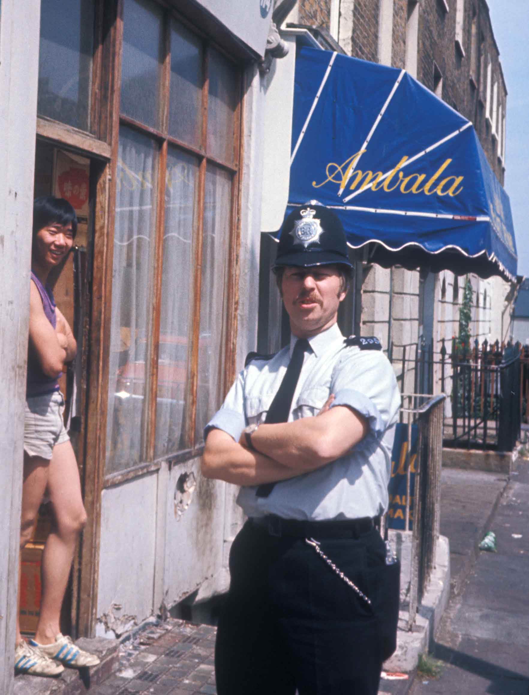 Neighbourhood policeman PC Norman on the beat in Drummond Street