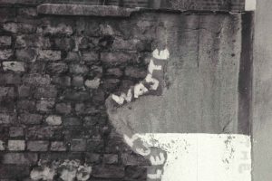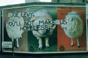 Doctored poster at the entrance of Tolmers Square from Hampstead Road.
