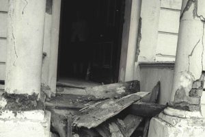 Partial collapse of balcony at 10 Tolmers Square, January 1976