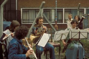Wind quartet playing in Tolmers passage during Carnival, 1975