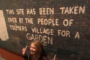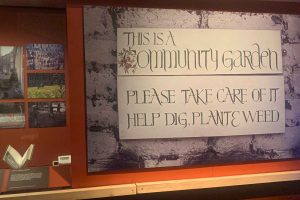 Curator Valentina Mirabella in front of an actual size photo of the 1974 community garden ...