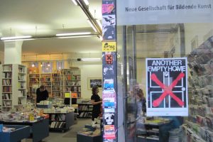 Berlin's gallery bookshop displays a poster from the Goodbye London exhibition on the entrance ...