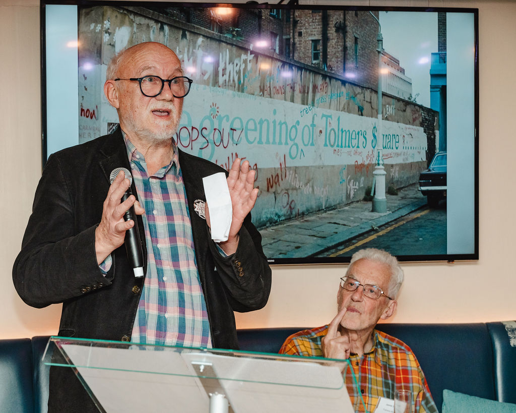 The event was hosted by Patrick Allen in the basement bar of law firm Hodge Jones & Allen at 180 North Gower Street, opposite the entrance to Tolmers Square. This firm was founded by Patrick when he was a squatter in Tolmers square in 1977. He has just retired from the practice after leading it for 48 years.