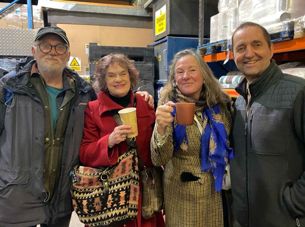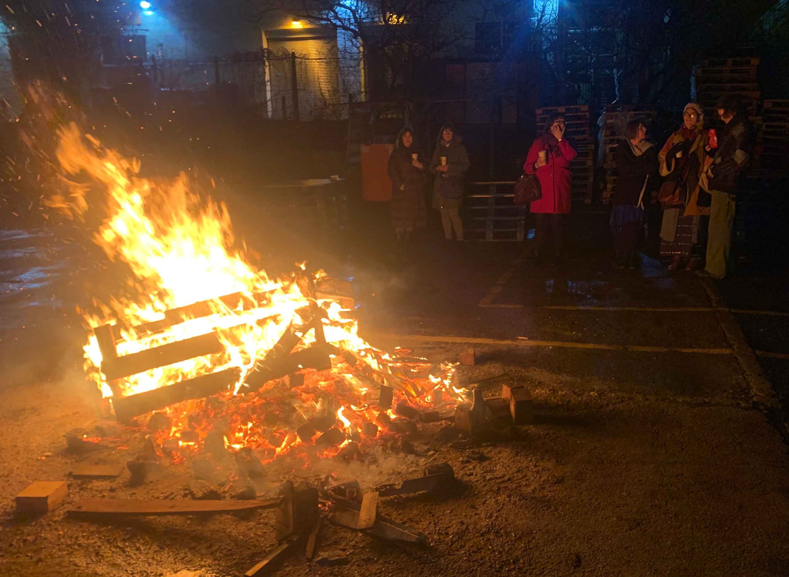 A bonfire of pallets in the yard helped guests feel at home (and warm)Muesli seems to keep Alex looking youngCorinne wassailing in amongst the 200 fruit trees, now several years old.An urban grottoCorinne in awe at Alara’s warehouse, remembering the muesli maker’s humble beginnings in Tolmers Square squats.Nick, Moyra, Sacha and Alex celebrate an enjoyable reunion (photo by Corinne).
